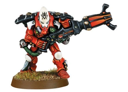 - Aspect Armour - Like other Aeldari Aspects, Warp Spiders wear lightweight synthetic bodysuits, reinforced with plates of psycho-sensitive bioplastics that will instantly harden to resist impacts. These plates can also morph their shape in accordance with the wearer's movements, meaning the armour does not encumber the wearer in the slightest, offering both good protection with excellent mobility. Using a compact Warp Spider Jump Generator housed within their armoured backpack, they utilise to make short Warp-jumps, disappearing and reappearing in the blink of an eye. This enables them to make totally unexpected attacks upon their foes, though it does necessitate spending a short time unshielded in the Warp. For this reason, the Warp Spiders risk not only their lives in the name of the victory, but also their souls. Warp Spider Aspect Armour is much bulkier compared to that worn by other Aspect Warriors, making the Warp Spiders more heavily armoured than their fellows but also among the slowest of the usually highly mobile Aeldari Aspects. While this would be more constricting for the movements of other Aeldari warriors, the Warp Spiders' unique teleportation abilities negate this disadvantage. Warp Spider Aspect Armour is also further warded to allow for safer travel through the Warp, which provides some protection against psychic powers when in realspace. The reinforced breastplate of the Aspect Warrior's armour bears his Spirit Stone, a precious item for all Aeldari. This psycho-receptive gem is attuned to the individual so that at the moment of death, when the Aeldari's psychic spirit is released, it is captured instead within the stone. Otherwise it is believed by the Aeldari that the spirit would be released into the Warp, where the Chaos God Slaanesh, "She Who Thirsts," awaits to consume it. Contrary to popular belief, the small domes and blisters on Warp Spider Aspect Armour are not extra gems, but small compartments that contain the suit's technical systems. A tabard or pennants are a common addition to Warp Spiders Aspect Armour. The armour's runic inscriptions name the Aspect Shrine for which the Aspect Warrior is fighting and identifies the the particular Craftworld that shrine is located upon. Regardless of a shrine's location, the Aspect's colour scheme is always some pattern of red, black and white.