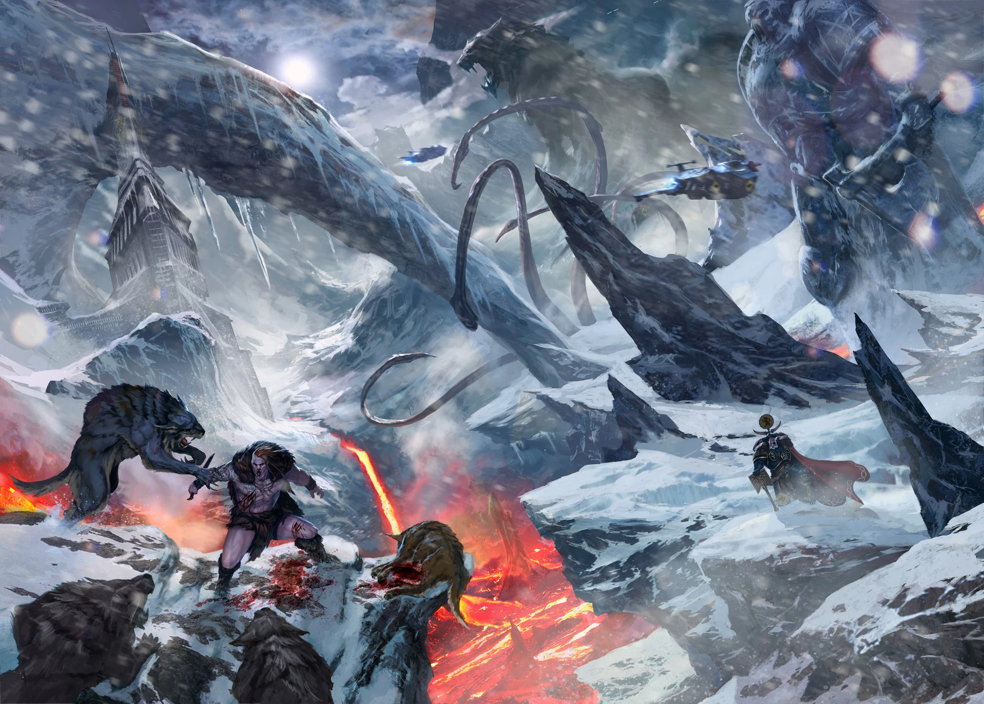 A Wolf Priest watches over a young warrior, as the Aspirant defends his life against the Fenrisian predators which stand between him and the Fang