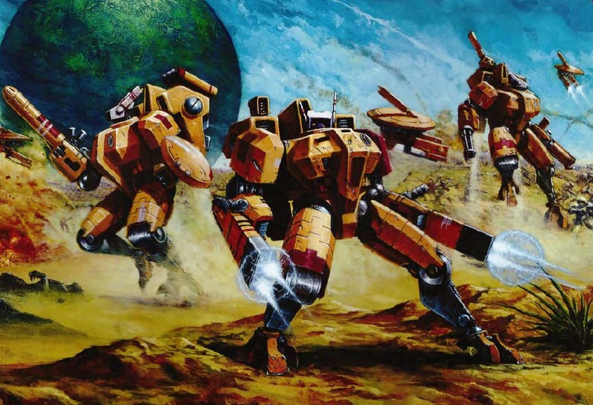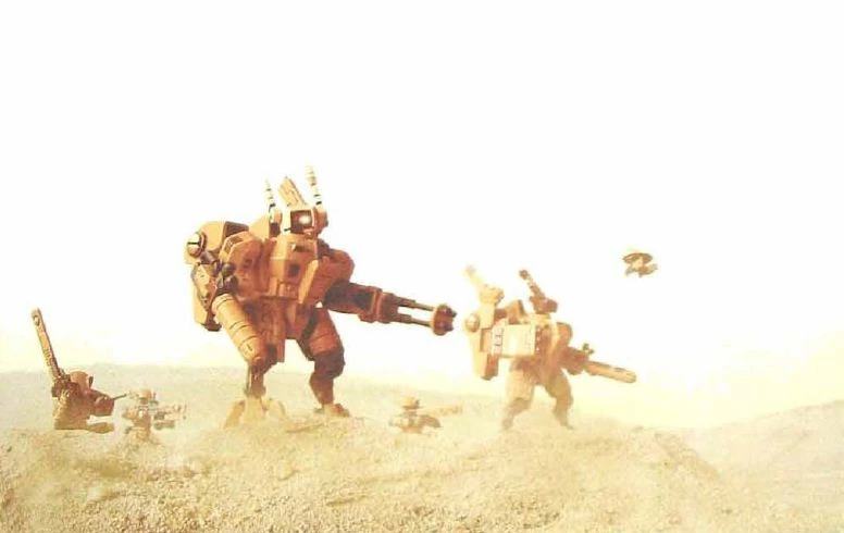 The earliest prototypes were field-tested during the early stages of the First Sphere Expansion, and although they were successful, the going was slow. The original fossil fuel-powered T-series was quickly replaced with the V-series, which used fission reaction, although radiation poisoning was still problematic. It was not until the end of that first period of rapid growth that Battlesuit technology began to regularly appear within the Hunter Cadres. Not surprisingly, it was at these final stages that the T'au won their largest battles, as the elite formations began to refine their tactics to take advantage of what the armoured suits could do.