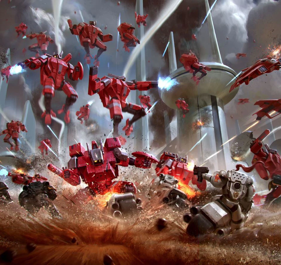 With their superior optics technology, major losses were inflicted upon the Imperial armour, with little damage being suffered in return. Humanity's elite Space Marines attempted to land behind T'au lines and regain the initiative, but were defeated by teams of heavily armed XV8s whose formidable firepower quickly downed their transports.